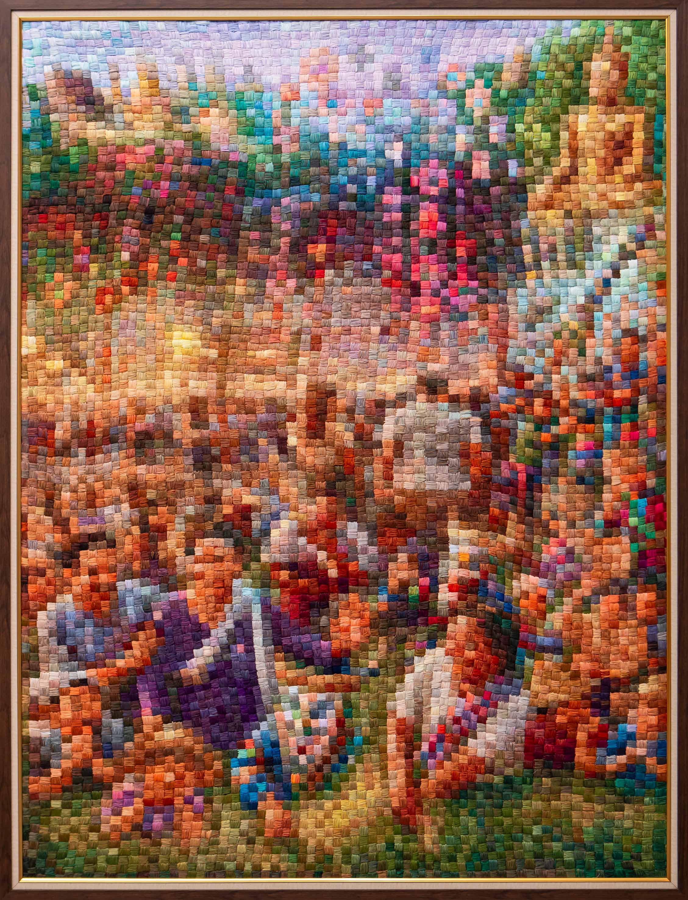 Threadwork stitched and embroidered in a mosaic-pixel fusion style