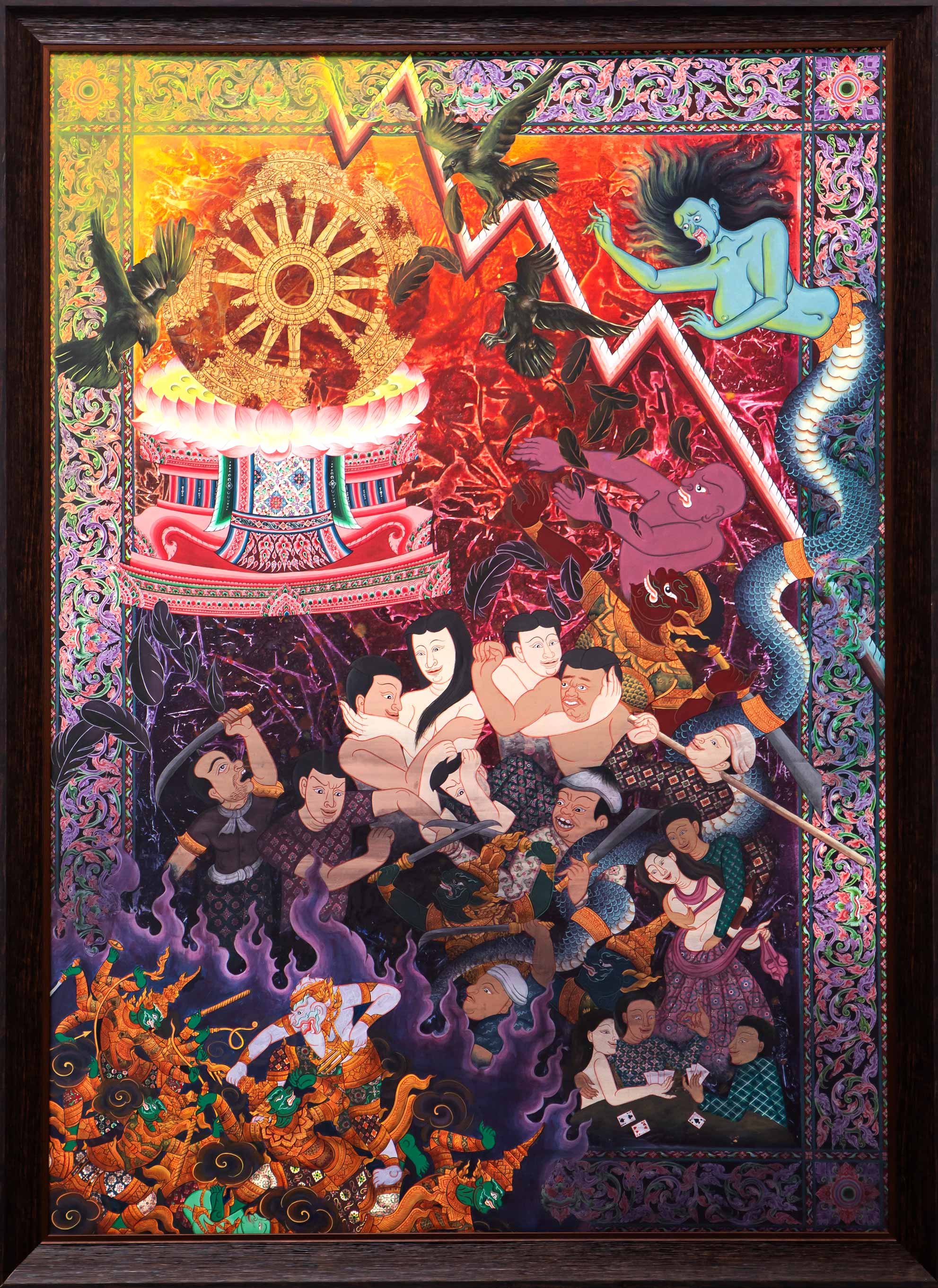 กิเลสที่หมักหมมทับถมอยู่ในจิตใจมนุษย์ ทำให้จิตใจเศร้าหมองด้วยความไม่รู้แจ้งของมนุษย์ทั้งความรัก โลภ โกรธ และหลง ก่อให้เกิดกิเลสตัณหาต่อตนเอง ต่อจิตใจพระพุทธศาสนาที่มุ่งเน้นการดับทุกข์การหลุดพ้นจากกิเลสแต่ด้วยความไม่รู้แจ้ง ความไม่ลดละการอยากได้อยากมีของมนุษย์ ก่อให้เกิดความเสื่อมทรามของสังคมและการลดความศรัทธาของพระพุทธศาสนา มีการเล่าเรื่องกิเลสที่แสดงออกถึงความรุนแรงกามราคะ การมัวเมาสุรา ศาสนามีการใช้รูปทรงของธรรมจักรเป็นสัญลักษณ์แทน มีการใช้ตัวภาพคน และตัวภาพอมนุษย์ครึ่งคนครึ่งงูกำลังเกี้ยวพันคนที่ก่อกิเลส